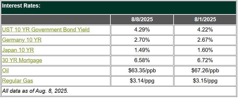 Markets regained their losses from the prior week, as the weak jobs number reignited expectations for a rate cut in September.6 The market seemed to take the tariff news in stride, but stumbled a bit as the president announced a 100% tariff on chips if they’re not made in the U.S.7 Then Apple got back on Trump’s good side by making a $600 billion commitment to produce iPhones here at home.8